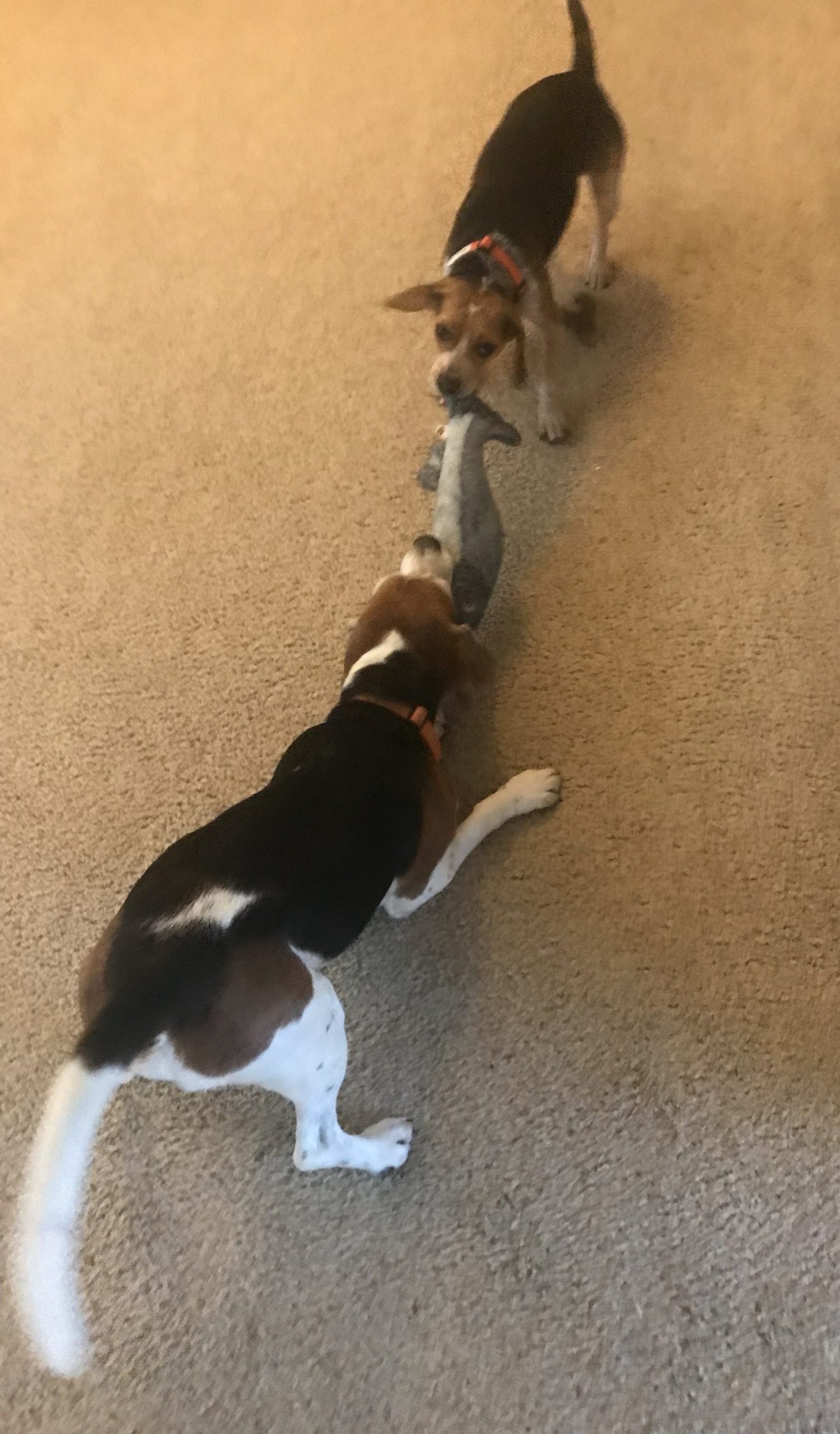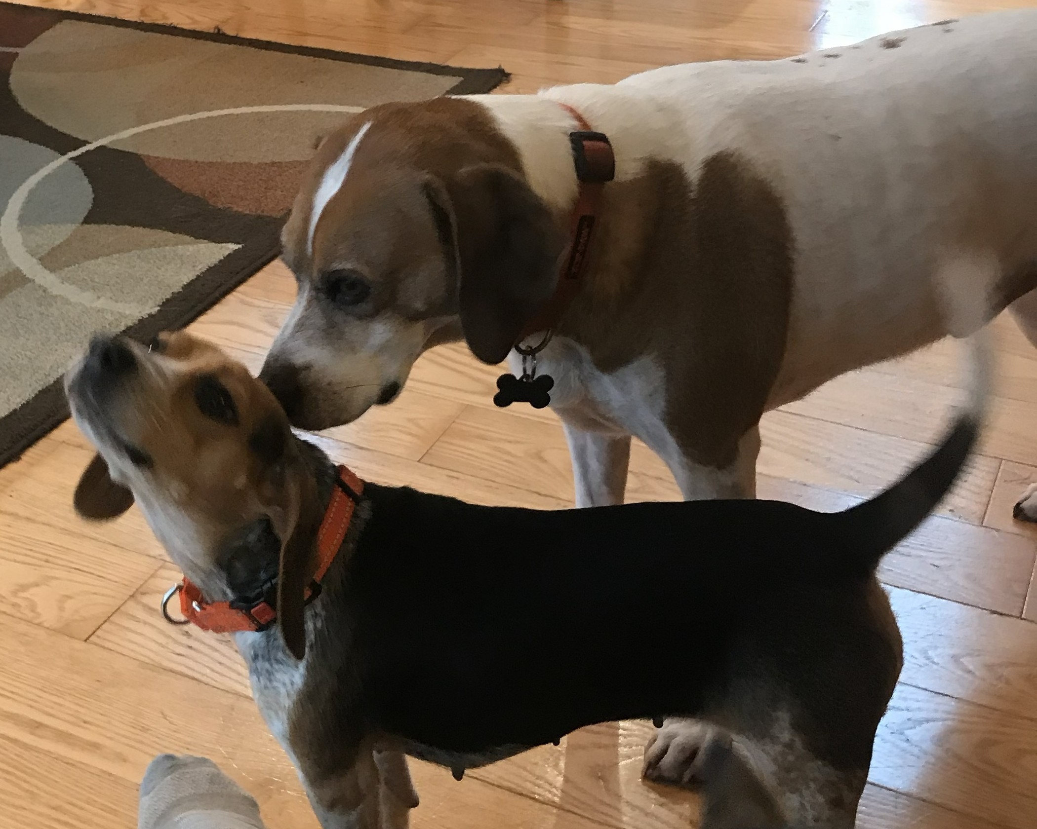 This bright, silly girl has a mischievous streak too! Lilly is an escape artist – pens and gates are merely suggestions in her beagle brain. She also loves to dig, stash food and bones around the house, and hide treasures in the corners of furniture. When playtime comes around, she’s all in: she hoards toys, plays rough, and has a signature move of flipping toys (especially tennis balls) into the air and chasing them full-speed. Outdoors, she unleashes her inner rocket and does joyful zoomies around the yard. While Lilly enjoys walks, she is not a fan of rain – classic beagle attitude. She does enjoy running through snow and stopping to have a few bites. She is kennel trained and partially potty trained, so continued structure and guidance will help her thrive.